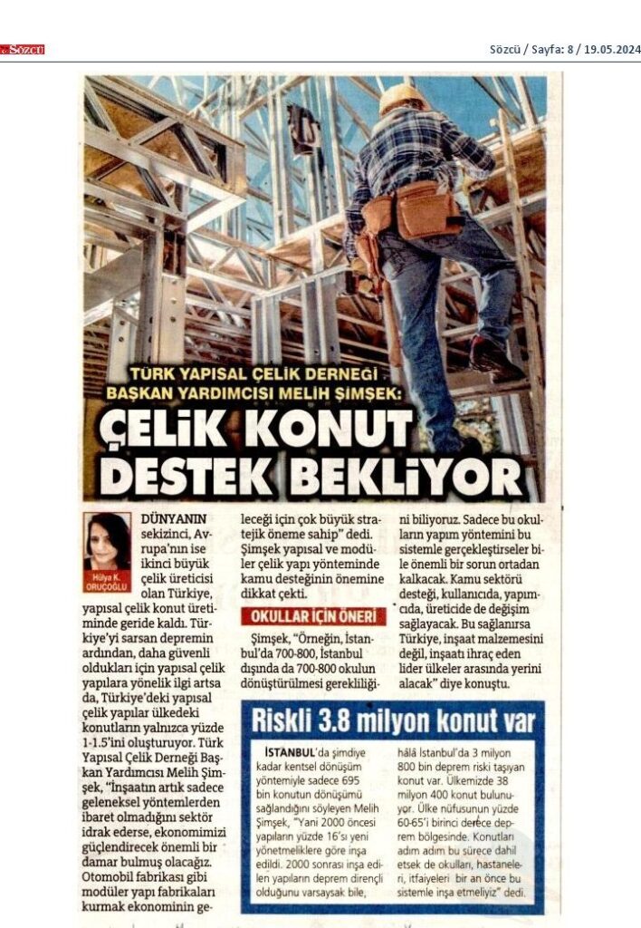 Turkey ranks eighth in the world and behind Europe in structural steel housing production. Following the earthquake that shook Turkey, interest in structural steel structures has increased because they are safer, but structural steel structures in Turkey make up only 1-1.5 percent of the country's housing stock. Melih Şimşek, Vice President of the Turkish Structural Steel Association, said, "If the sector realizes that construction is no longer just about traditional methods, we will have found an important vein that will strengthen our economy. Establishing modular construction factories like automobile factories is of great strategic importance for the future of the economy." Şimşek emphasized the importance of public support in the structural and modular steel construction method.